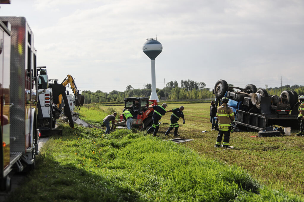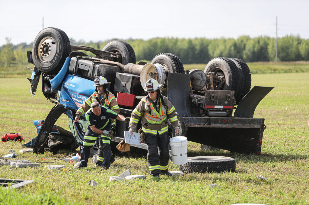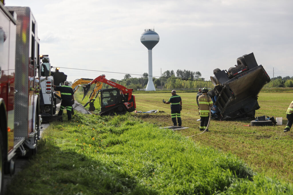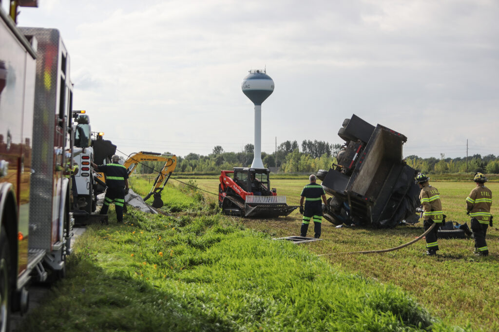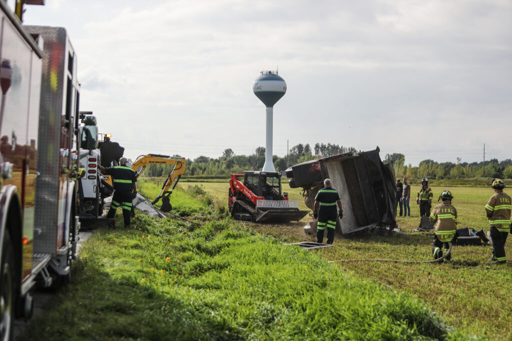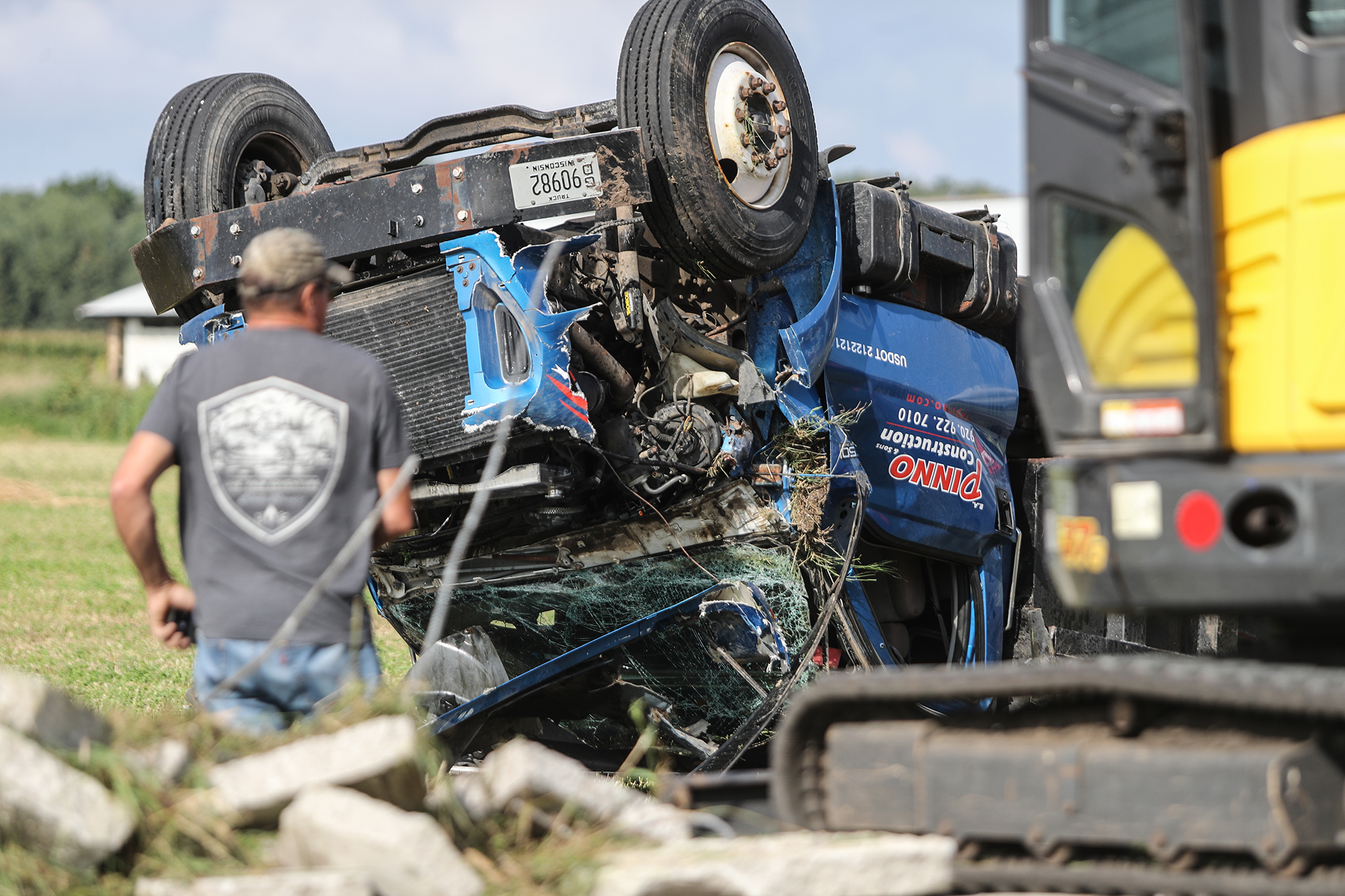 The crash was reported at 2:30 pm on Brown Road, just east of Townline Road, west of Fond du Lac. Upon arrival, Town of Fond du Lac Fire and First responders, City of Fond du Lac Ambulance, Fond du Lac County Sheriff Deputies and State Patrol Troopers found the dump truck rolled over in a field on the north side of the road. According to law enforcement on scene, the driver left the roadway on the southside of the roadway as they were driving eastbound. The driver over-corrected and left the roadway on the north side of the road, rolling over.