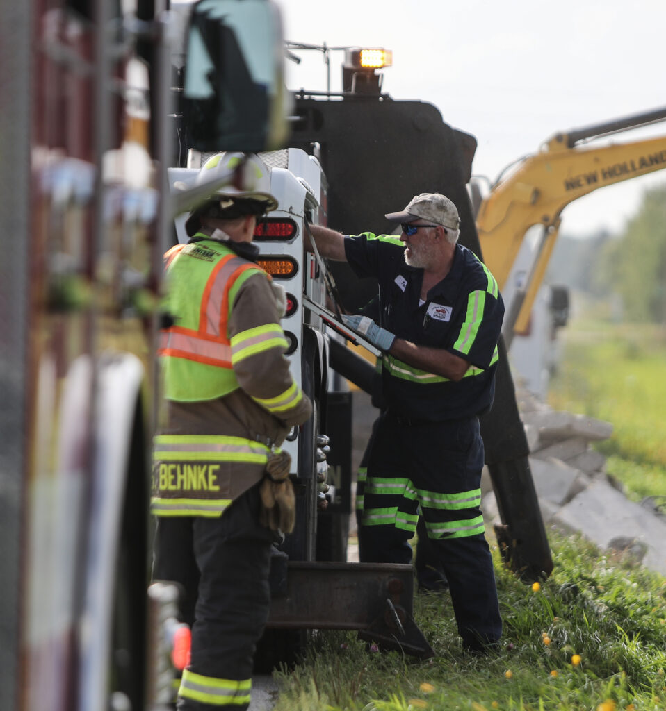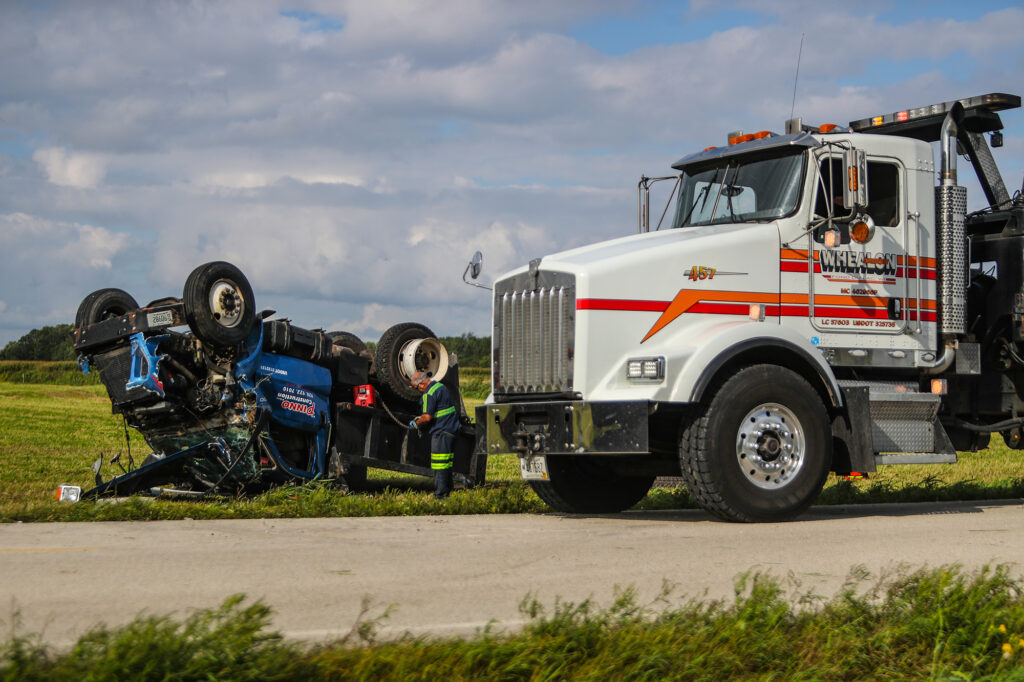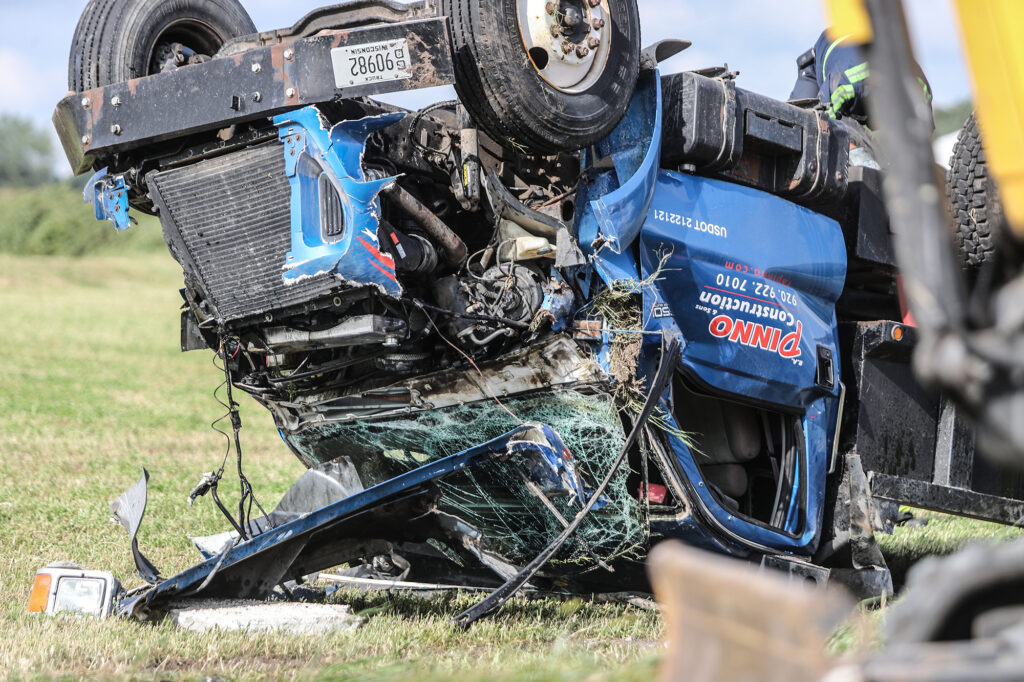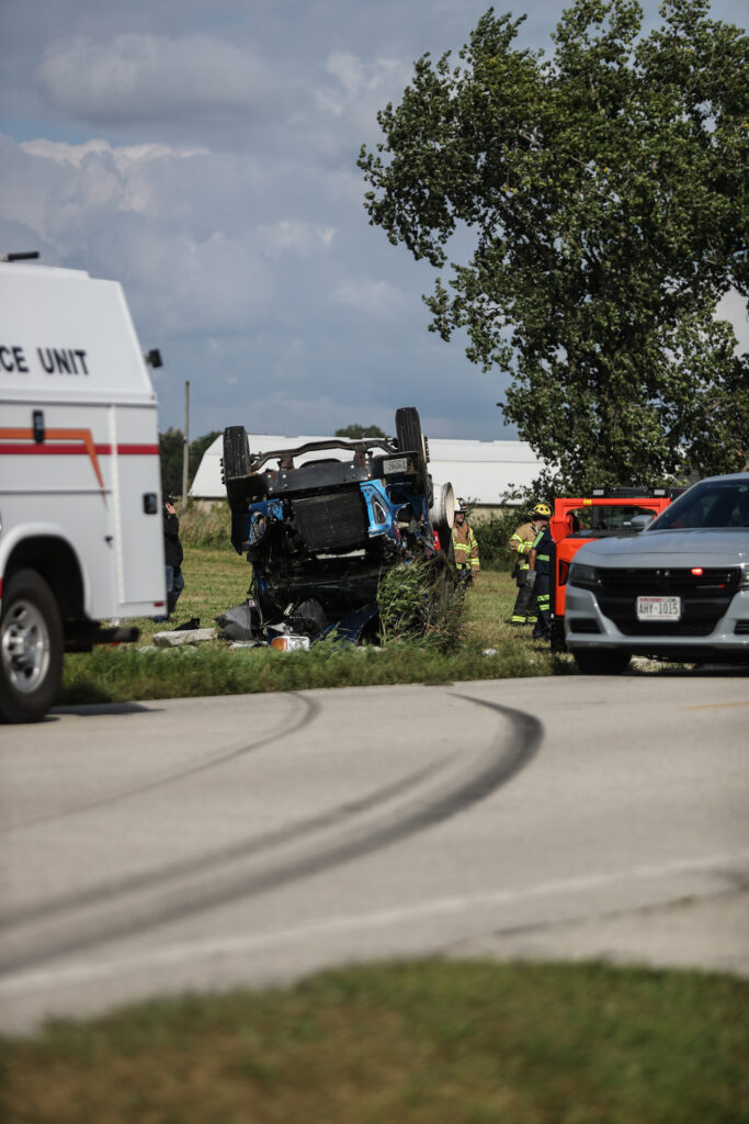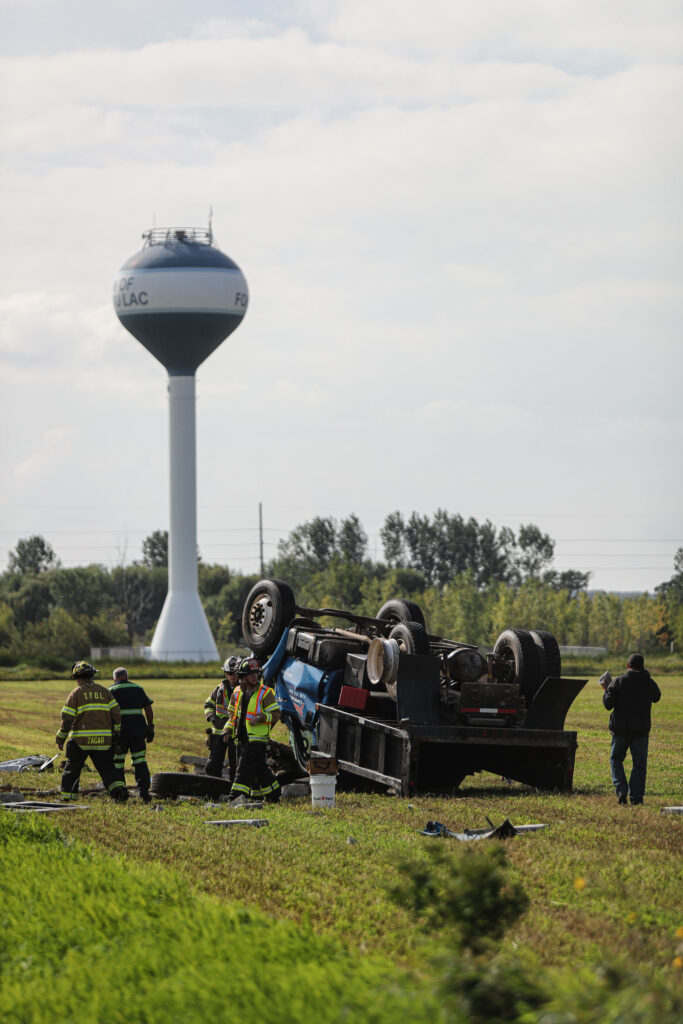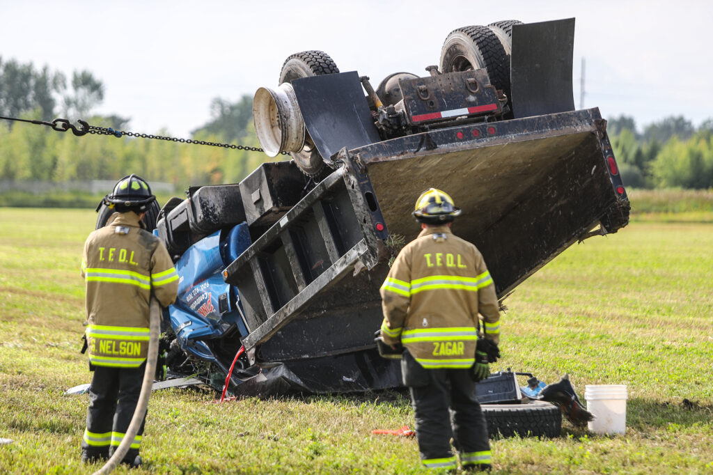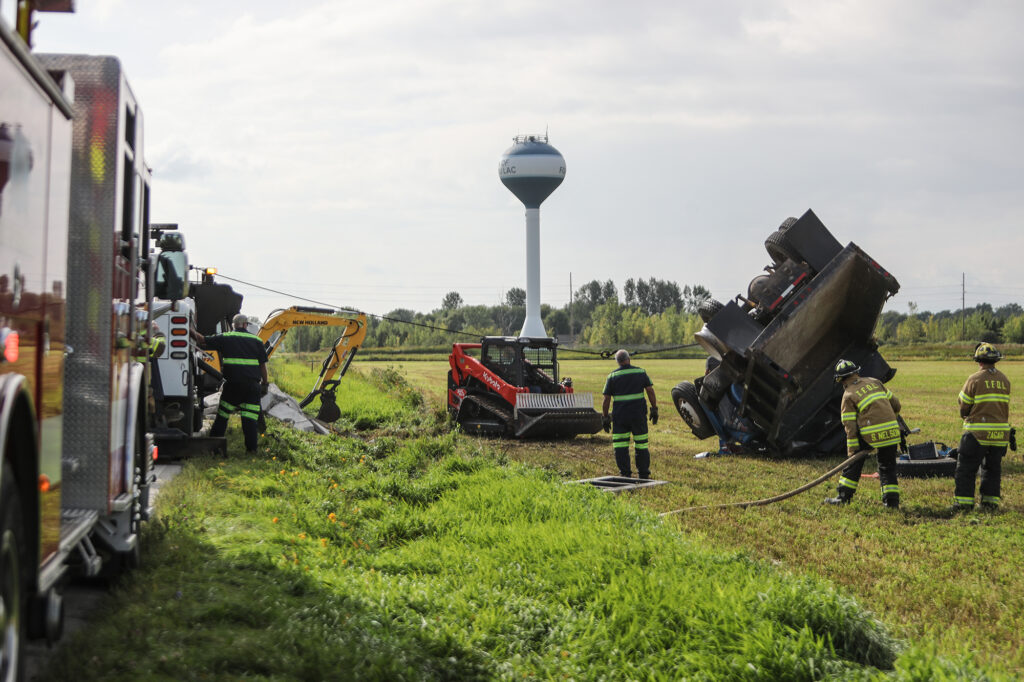 The crash was reported at 2:30 pm on Brown Road, just east of Townline Road, west of Fond du Lac. Upon arrival, Town of Fond du Lac Fire and First responders, City of Fond du Lac Ambulance, Fond du Lac County Sheriff Deputies and State Patrol Troopers found the dump truck rolled over in a field on the north side of the road. According to law enforcement on scene, the driver left the roadway on the southside of the roadway as they were driving eastbound. The driver over-corrected and left the roadway on the north side of the road, rolling over.