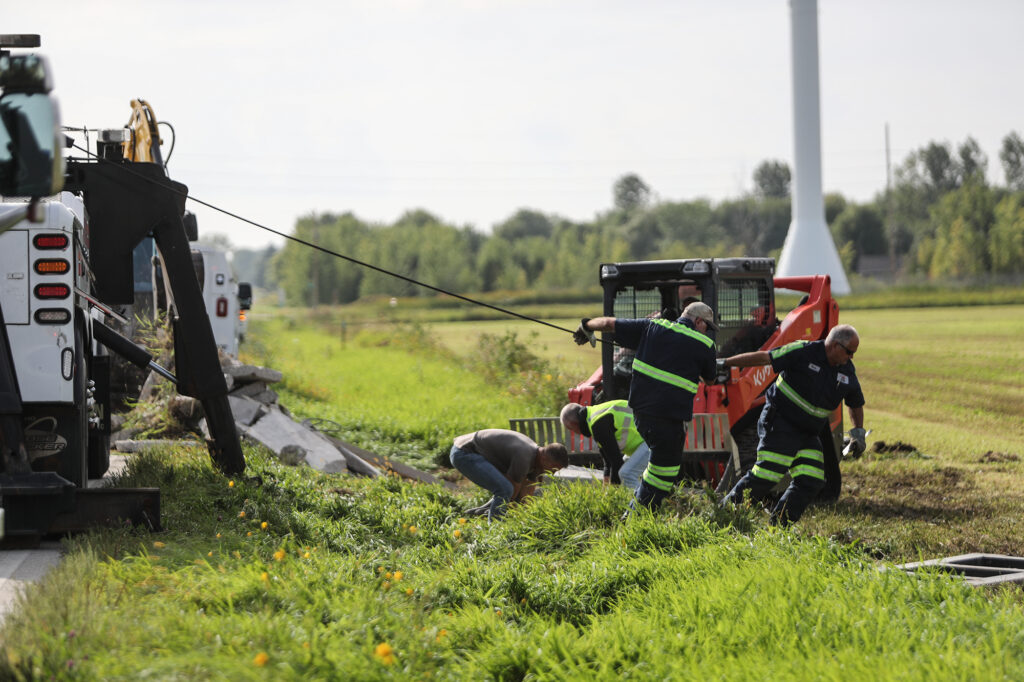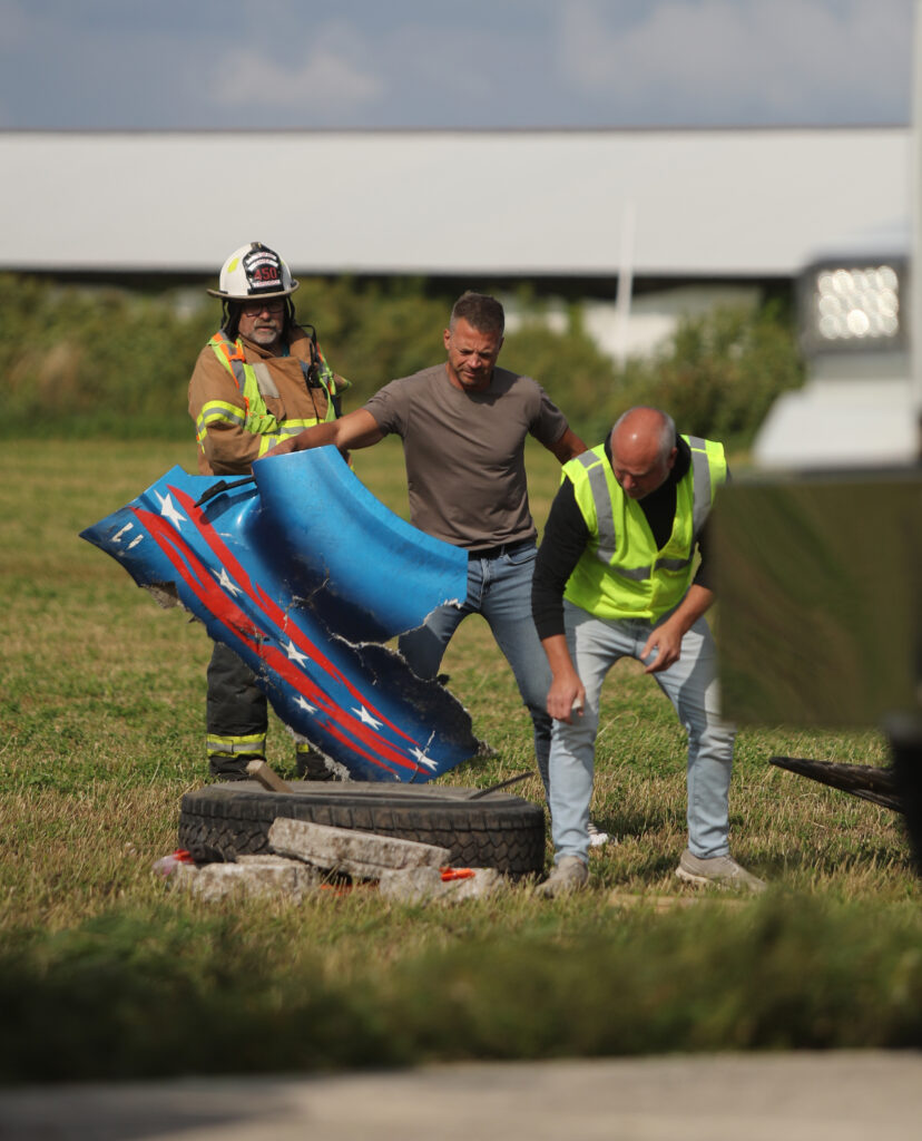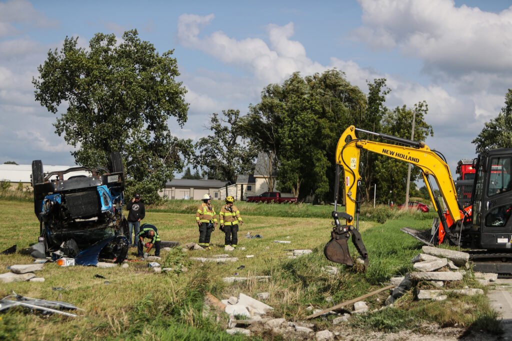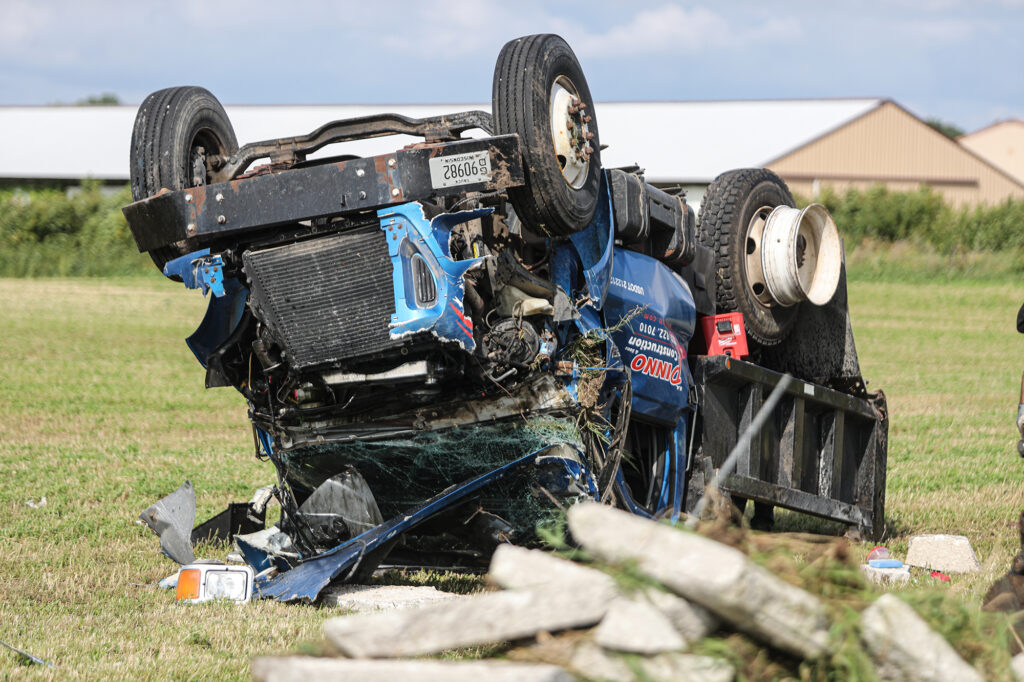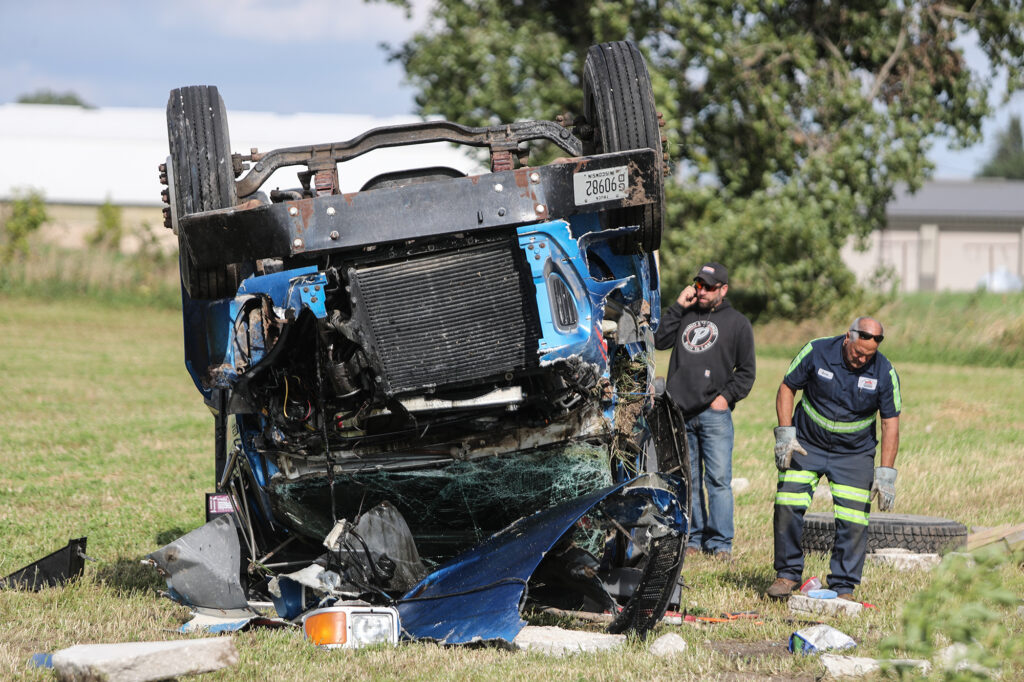 According to KFIZ News Director Doug Raflik on the scene, the truck was hauling cement pieces and rebar. Equipment was brought in to clean up the debris out of the field.