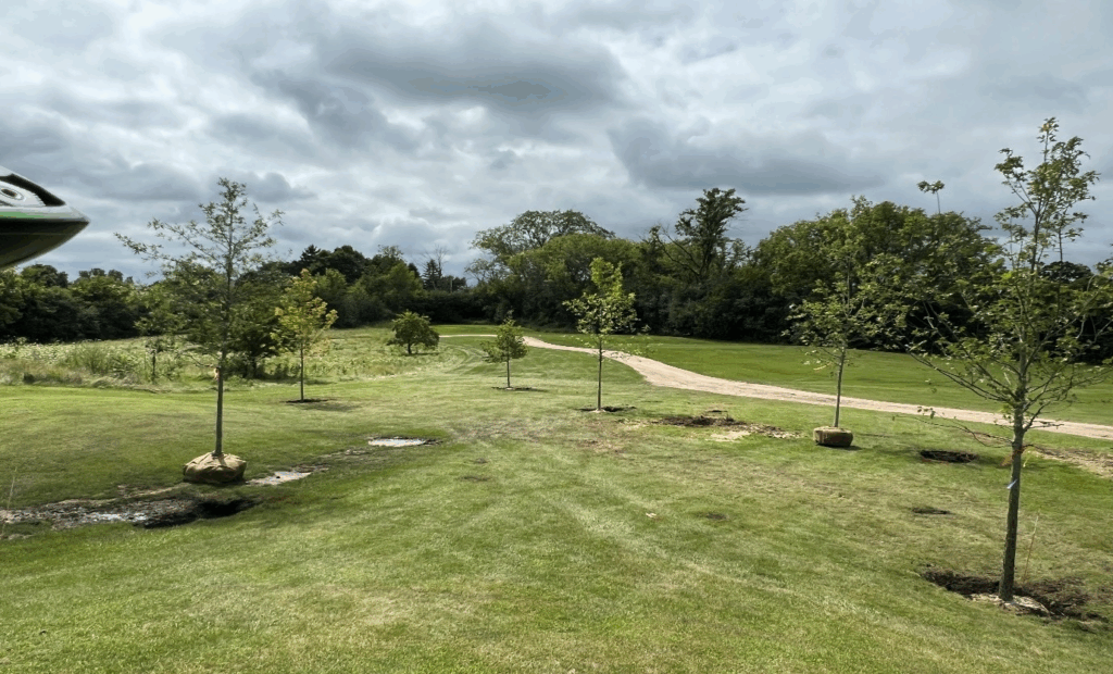 The landscape quality trees selected consist of 2 Overcup Oaks, 2 Northern Red Oaks and a Willow Oak. A Brandy Wind Scarlet Maple Tree and an American Beech Tree complete the tree selection. The trees are located between holes #23 & #24 and will provide a beautiful barrier between the holes. The Beech tree, while slow growing lives over 200 years and will provide shade for generations!