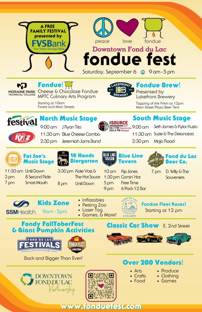 This year marks the 18th annual Fondue Fest and will take place on Saturday, September 6, from 9 a.m. to 5 p.m. This community favorite features live music, local food, artisan vendors, and activities for all ages as well as Cheese and Chocolate Fondue made and served by Moraine Park Technical College’s Culinary Arts program students and instructors.
