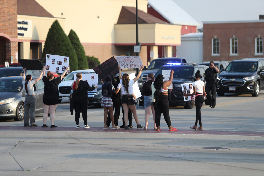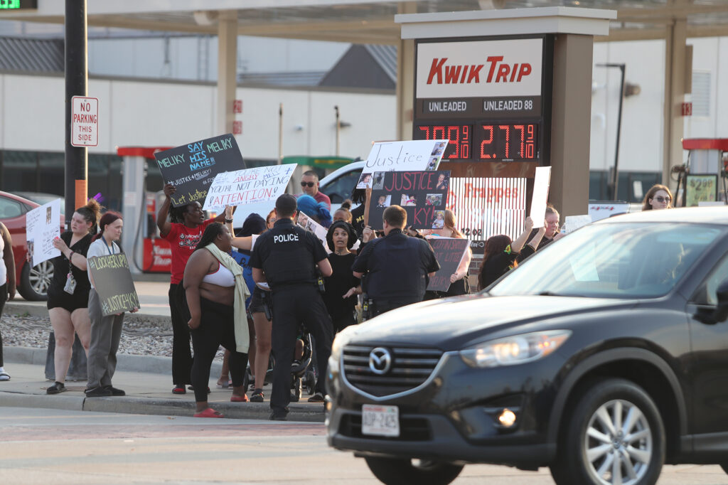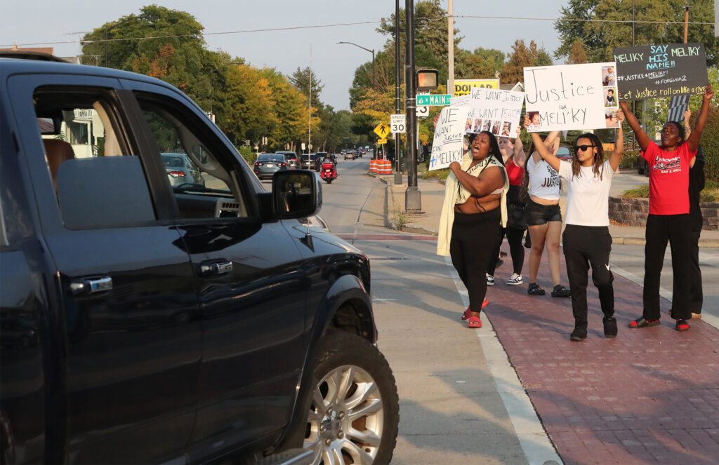 About two dozen people holding signs and chanting “Justice for Meliky” and “No Justice, No Peace” gathered on north Main Street in Fond du Lac Thursday afternoon to protest the way they feel the Fond du Lac Police have handled a death investigation of one of the protesters two-year-old children who passed away Saturday, September 13, 2025 at Maplewood commons.