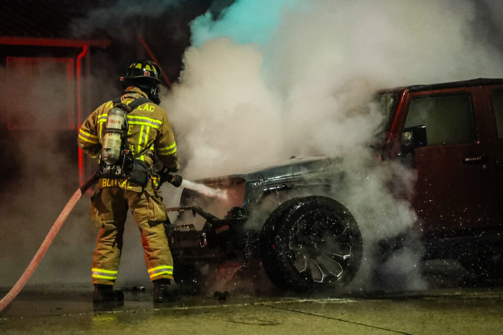 On scene they found a jeep in the westbound lanes of traffic with the engine compartment fully engulfed in flames. All the occupants were able to make it out of the vehicle.