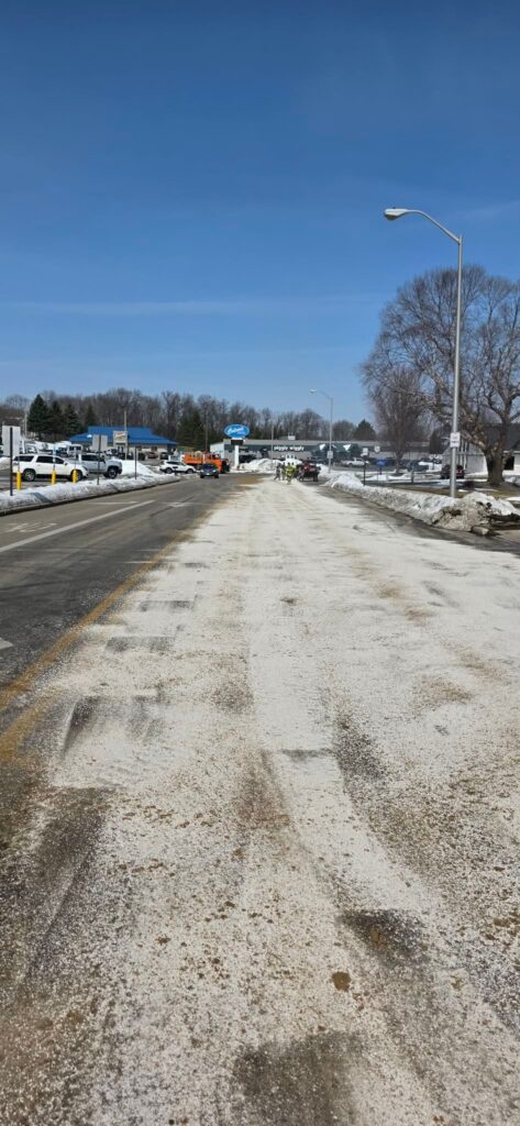 Oil dry was left on the roadway so that traffic can work it in. DPW crews will return on Monday to sweep up the leftover debris.