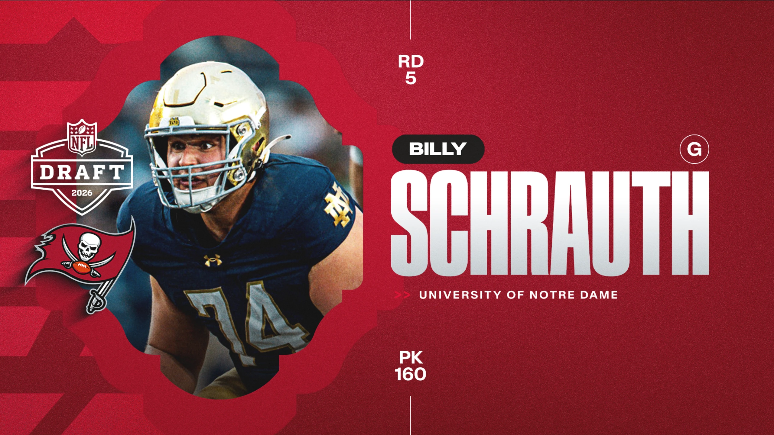 The Tampa Bay Buccaneers have selected Notre Dame guard Billy Schrauth with the 160th overall pick in the 2026 NFL Draft. Schrauth was a two-year starter and a captain for the Fighting Irish, and a graduate of St. Mary’s Springs Academy. In 2025, he was named a second-team All-American and has experience starting at both guard positions. Schrauth is a technically sound blocker who fits right into a Buccaneers group committed to the process.
