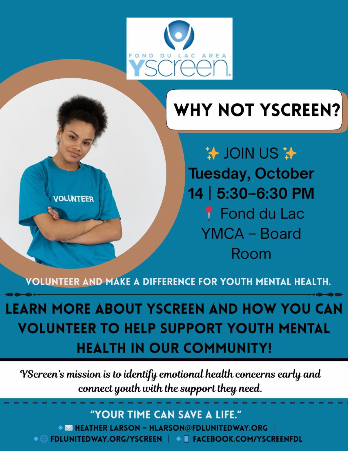 Join Fond du Lac Area YScreen for their Why Not Screen? event, happening on Tuesday, October 14th from 5:30pm-6:30pm. This event will take place in the Board Room at the Fond du Lac Family YMCA (located at 90 W 2nd St, Fond du Lac, WI 54935). Come learn what YScreen does and how you can volunteer to support youth mental health in the community. Your time can save a life. For questions, contact Heather Larson at hlarson@fdlunitedway.org. For more information, visit https://www.fdlunitedway.org/yscreen.