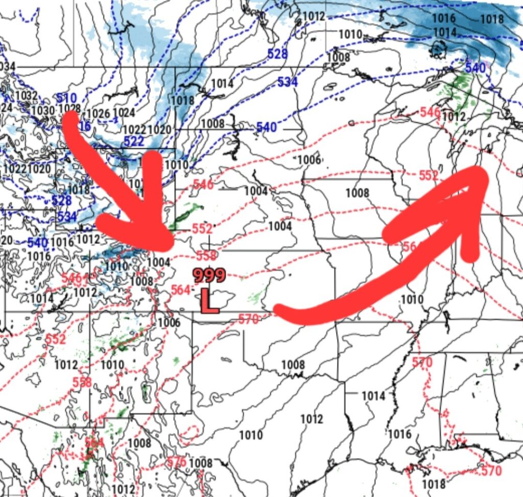 Because of this path, the storms also bring warmer air out in front of the storm system as winds flow counterclockwise around low pressures. So winds will be out of the south on the eastern side, then turn from the north on the western side of the system.