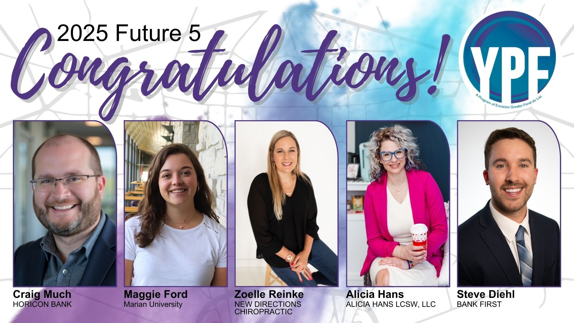 The Young Professionals of Fond du Lac (YPF) established the Future 5 Award in 2013 to support and recognize upcoming leaders in the community. This award is presented to five area young professionals aged 21-40 who are presently growing and excelling in their respective fields and will continue to positively influence the growth, prosperity, and quality of life in Fond du Lac County well into the future.